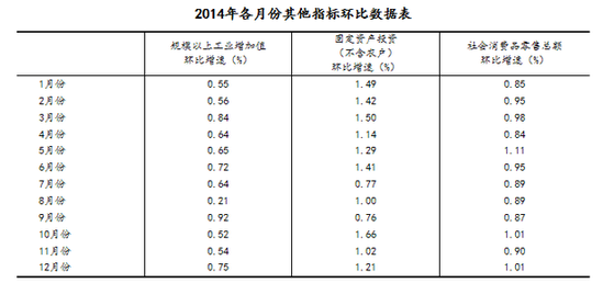 (2)根据季节调整模型自动修正结果,对近一年来各期国内生产总值、规模以上工业增加值、固定资产投资(不含农户)、社会消费品零售总额环比增速进行修订。修订结果及2014年四季度GDP环比数据、2014年12月份其他指标环比数据如下: