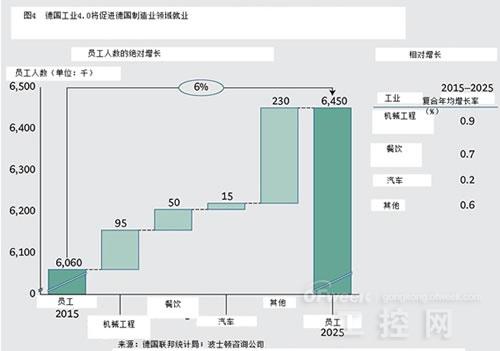 就业方面。工业4.0将使德国在未来五年内就业增长6%。(如图4)在同一时期,机械工程部门对员工的需求可能会上升10%之多。然而,也会因此需要会不同技术的人。在短期内,自动化的趋势将取代一些操作简单、重复率高的低技能的工。同时,软件、连接和分析越来越多地被使用,将增加对软件开发和相关技术员工的需求。