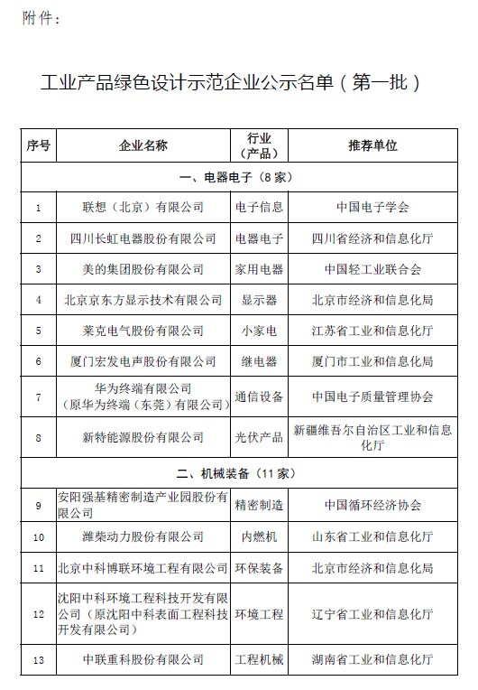 为贯彻落实国务院有关要求,2014年,工业和信息化部印发了《工业和信息化部关于组织开展工业产品生态设计示范企业创建工作的通知》(工信部节函〔2014〕308号),先后确定了两批共99家绿色(生态)设计试点企业。2018年以来,工业和信息化部对完成试点工作的企业陆续进行了验收,共有61家试点企业通过验收。现将拟确定为工业产品绿色设计示范企业(第一批)的名单予以公示。如有异议,请在公示期间内与工业和信息化部节能与综合利用司联系,并提交相关证明材料。